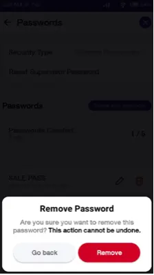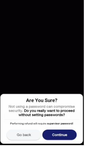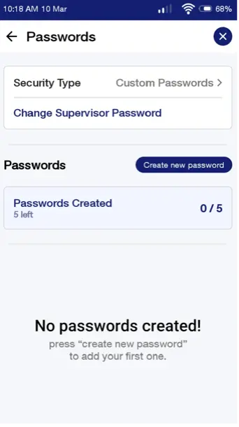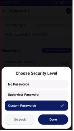 Once the security level is successfully set to "configure passwords", Custom Password(s) can be configured. There is a limit of 5 Custom Passwords which can be set on the terminal.